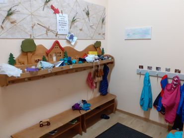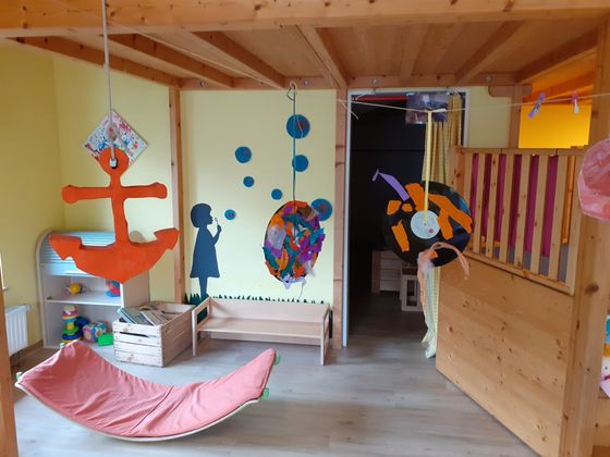 Gruppenraum mit Empore, ein Spiel-Ruhe-Bewegungsraum, ein eigener Essraum mit Küche, sowie ein eigener Waschraum mit Kleinkindtoilette und Wickelplatz.