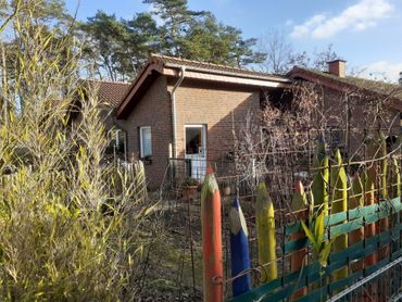 Der Außenbereich bietet neben einem Spielplatz mit Trampolin und Bachlauf auch einen Obst- und Gemüsegarten sowie ein Gewächshaus.